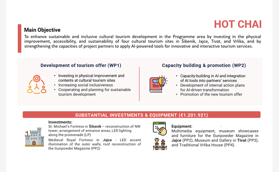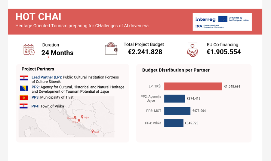 The project connects four destinations — Šibenik, Jajce, Tivat, and Vrlika — with the aim of jointly developing and strengthening their cultural‑tourism offer. The main objective of HOT CHAI is to advance sustainable cultural tourism through investments in cultural‑site infrastructure, improved accessibility, and capacity‑building for project partners in the use of AI‑based tools for creating innovative and interactive tourist services.