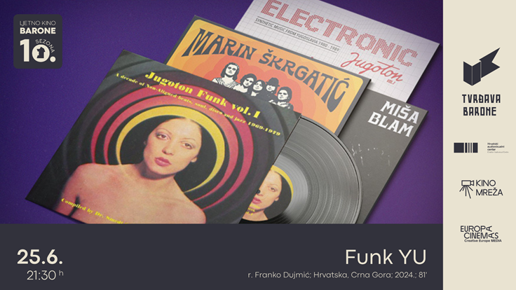 U srijedu, 25. lipnja, projekcijom dokumentarnog glazbenog filma FUNK YU redatelja Franka Dujmića, počinje deseto ljeto na najljepšoj šibenskoj filmskoj pozornici - Ljetnom kinu Barone. Redatelj Dujmić, ujedno i kolekcionar vinila, u filmu nas vodi kroz svoju potragu za jednim od najboljih primjera jugoslavenskog funka i jedinim vinilom koji nedostaje njegovoj kolekciji - Ulica Jorgovana / Zlatokosa Darka Domijana. Na tom putovanju kroz bivšu Jugoslaviju susreće mnogobrojne zanimljive likove i donosi uzbudljiv glazbeni kolaž za sve zaljubljenike žanra. Funk YU će u razgovoru nakon projekcije predstaviti redatelj Franko Dujmić, a druženje će se potom nastaviti uz glazbeni after party i Dj Pipsa, člana Hrvatske Funk Delegacije i neumornog istraživača dobrog funka i soula koji tjera na ples.