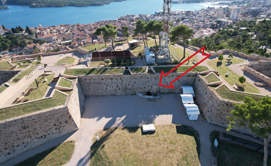 It is assumed that the 70-meter-long tunnel was excavated by the German army in 1944. Located at the base of the fortress’s main wall, it runs north–south. The entrance is irregular, while the southern exit ends with a staircase and a concrete observation bunker overlooking Šibenik and its archipelago. Unlike many other tunnels from that period, it is not lined with concrete but carved directly into limestone rock.